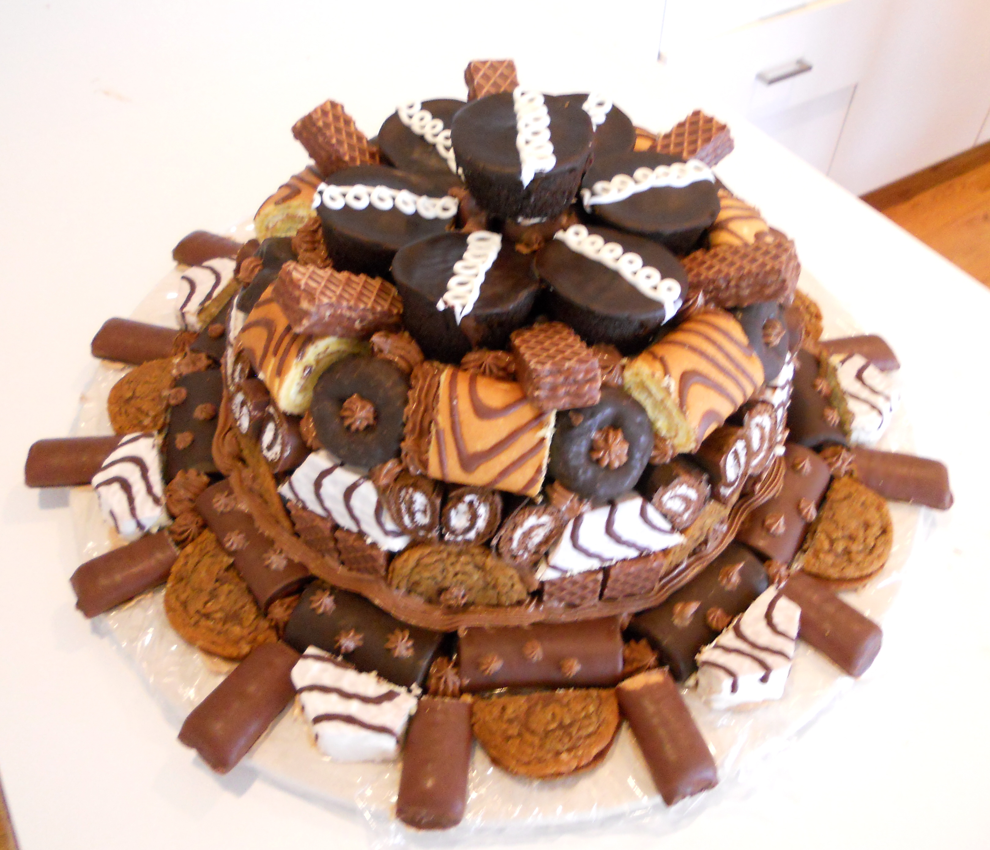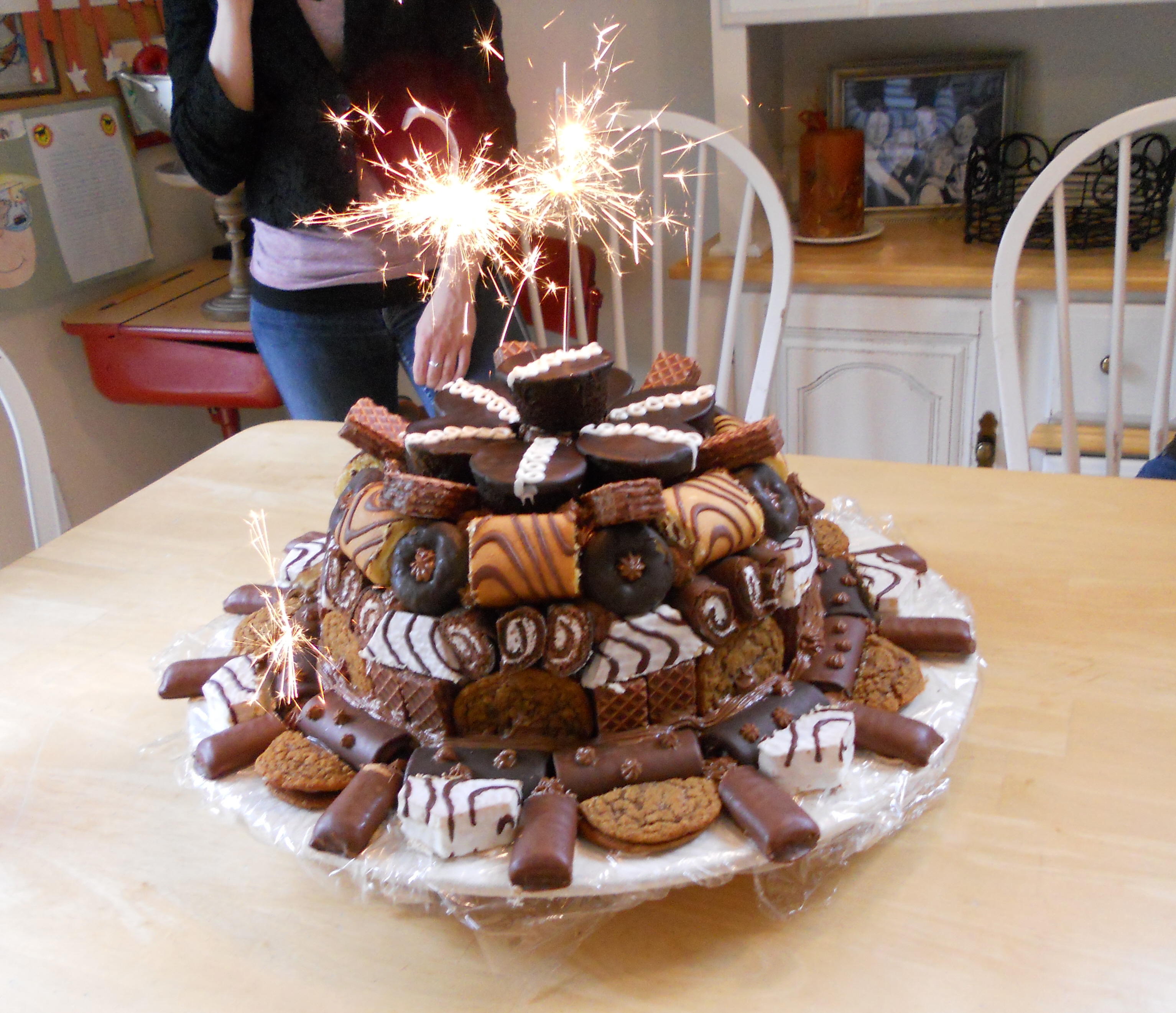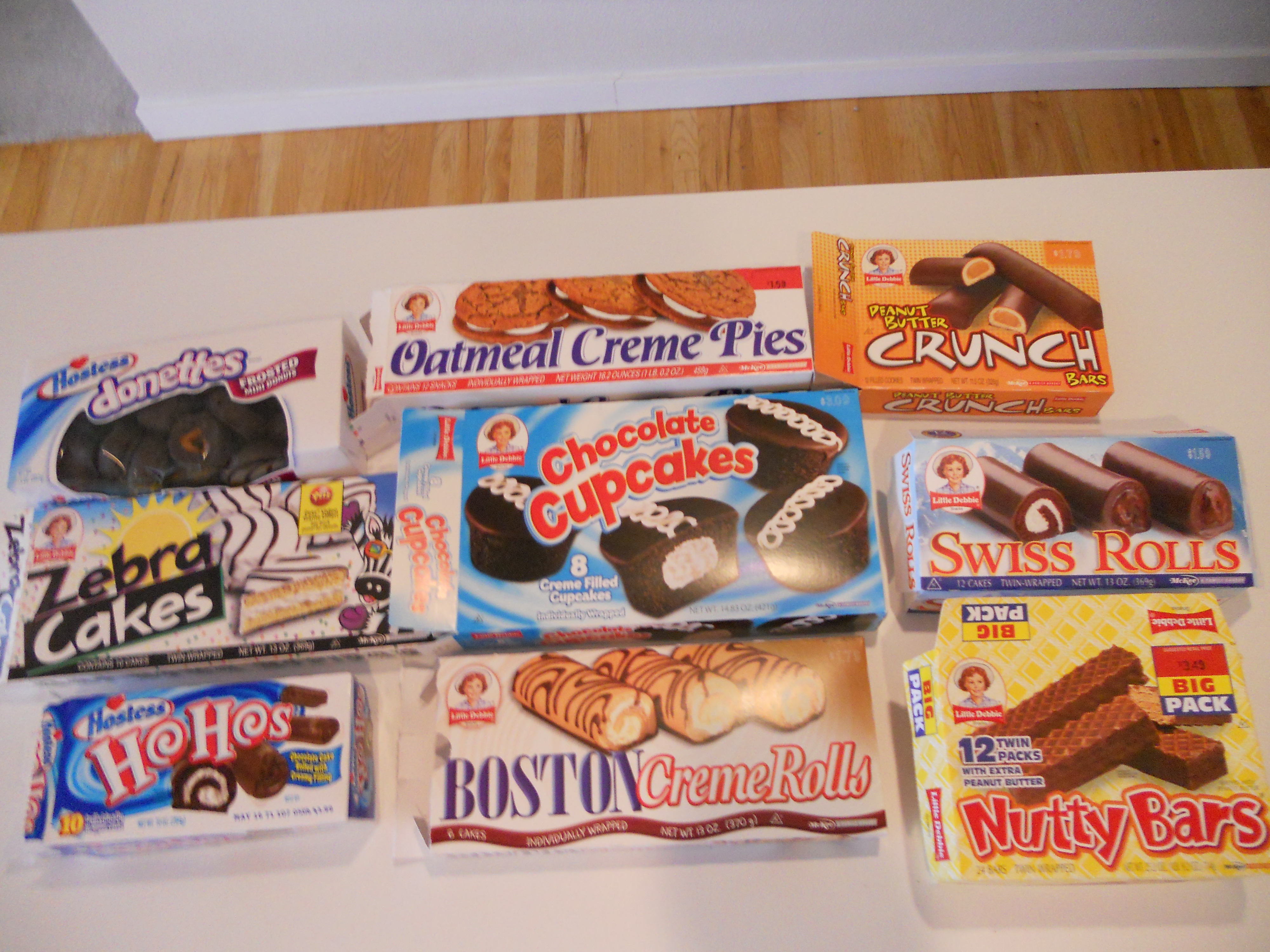 First I bought all the ingredients one would use to make a normal giant cake, then I bought the snacks: Oatmeal Creme Pies, Hostess Donettes, Zebra Cakes, Swiss Rolls, Chocolate Cupcakes, Boston Creme Rolls, Nutty Bars, Ho Hos, and Peanut Butter Crunch