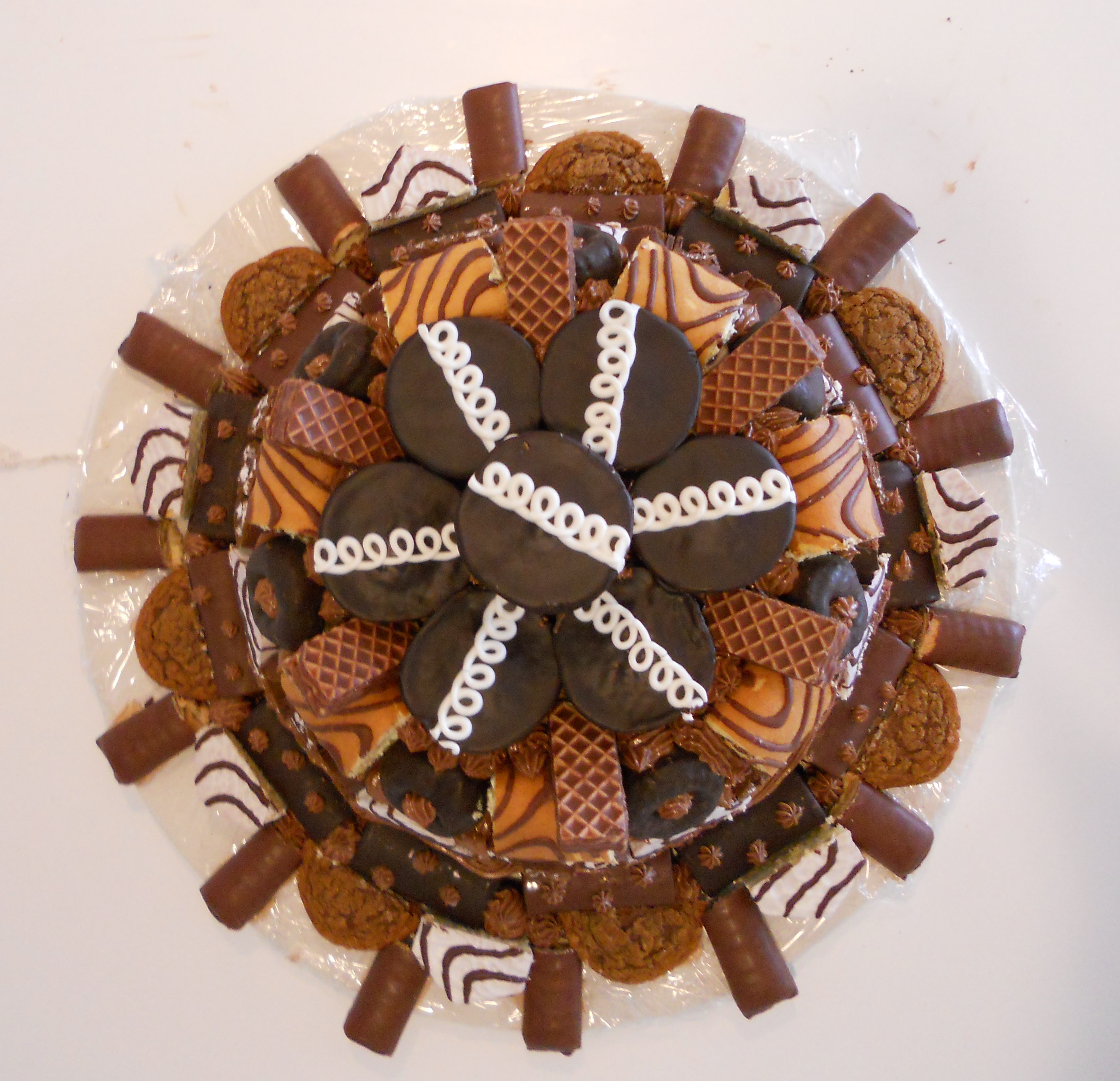 Once the base was completed I began to decorate the outside with the little debbie snacks. It’s pretty easy to fit the snacks together into little designs. I could not help but giggle the entire time I was doing this. It was difficult, what with the sugar induced shaking, but I managed to piece together the cakes into my own version of The-Not-So-Little-Debbie-Cake. Take a look: